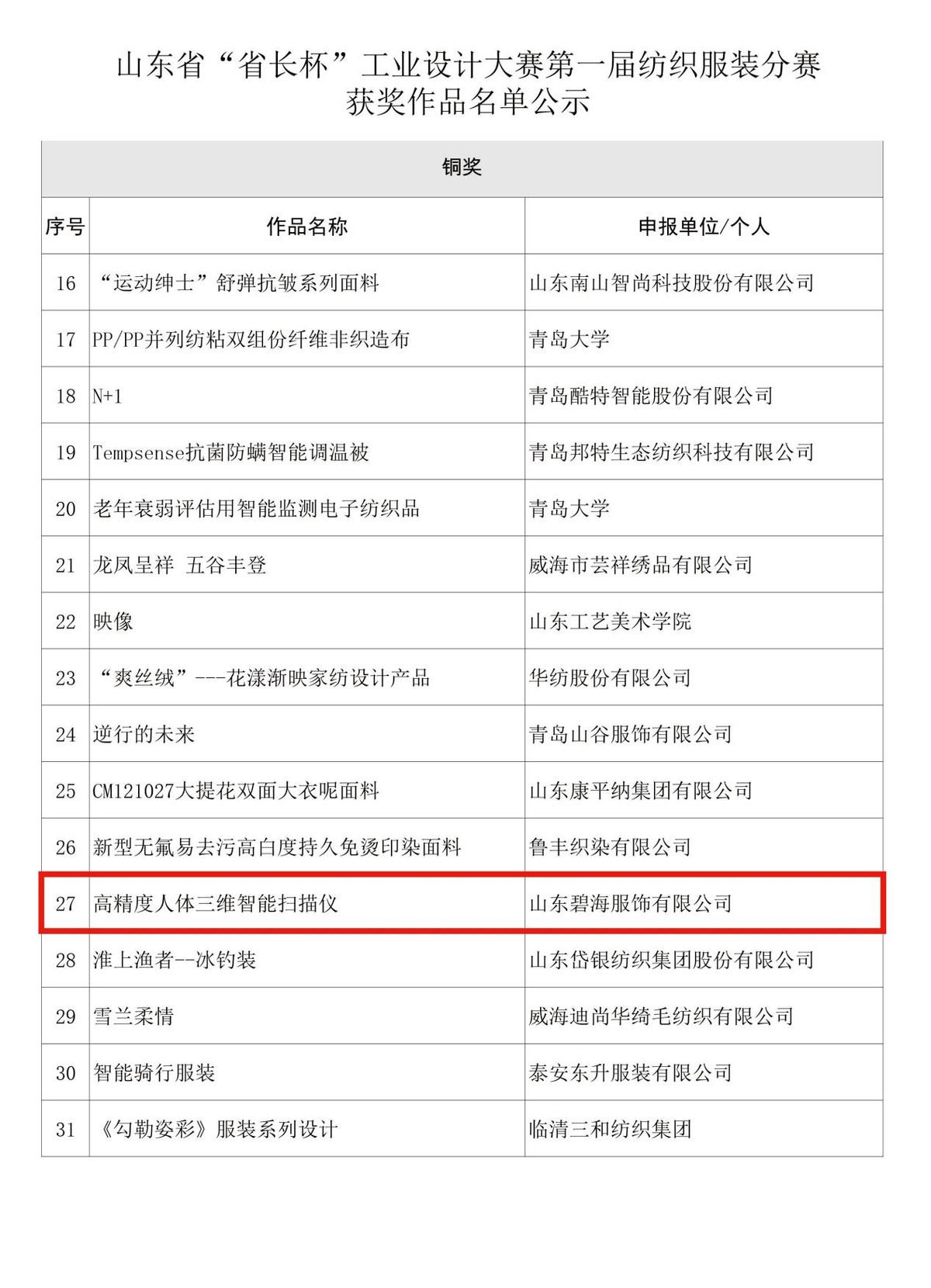 近日来,由山东省人民政府主办,中国工业设计协会支持,山东省工业和信息化厅、山东省教育厅、山东省财政厅、山东省市场监管局、山东省总工会、共青团山东省委、山东广播电视台承办的,山东省各市工业和信息化局、山东省工业设计协会协办的山东省“省长杯”工业设计大赛第一届纺织分赛落下帷幕。 2022年07月28日,山东省工信厅发布了山东省“ ”工业设计大赛第一届纺织分赛的评审结果。本次大赛,经过了初赛、复赛、决赛的三轮专家评审,对线上材料和线下实物展示等多方面结合,山东碧海标志服装有限公司旗下分公司——山东碧海服饰有限公司研发的高精度人体三维智能扫描仪荣获山东省“省长杯”工业设计大赛第一届纺织分赛铜奖。