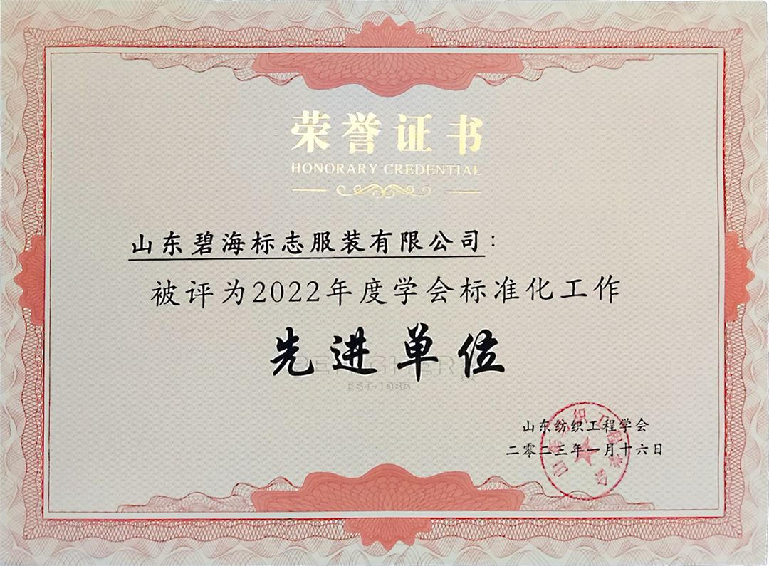2023年1月16日,山东纺织工程学会——2022年度学会标准化工作先进单位名单揭晓。经学会综合评审,山东碧海标志服装有限公司获得“#2022年度学会标准化工作先进单位#”荣誉称号。 据了解,#山东纺织工程学会# 成立于 1949 年,是山东省纺织服装科学技术工作者和有关单位自愿结成并依法在民政厅登记注册的全省性、学术性、科普性、非营利性社会组织,主管部门为山东省科学技术协会。