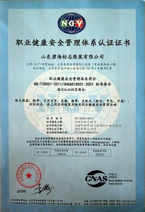 职业健康安全管理体系认证证书